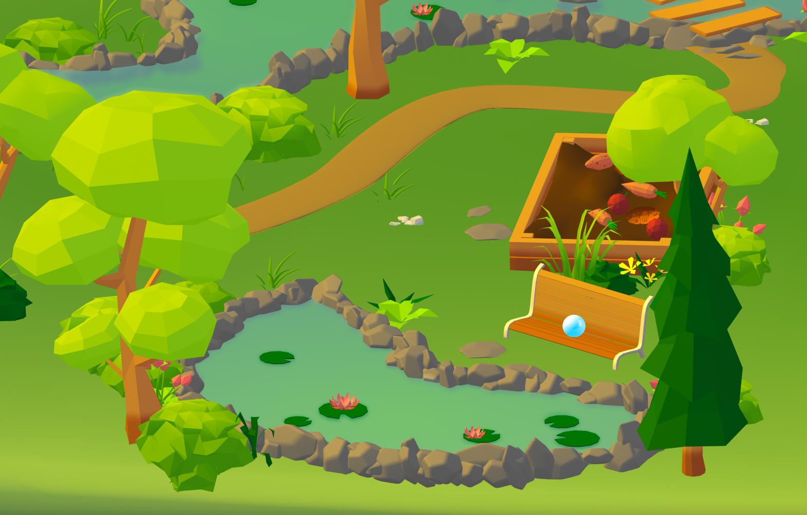 The core component, The Music Playground, is a web-hosted interactive experience built from a 3D environment modeled in Spline, where a small blue ball moves through the landscape and triggers looping audio as it rolls.